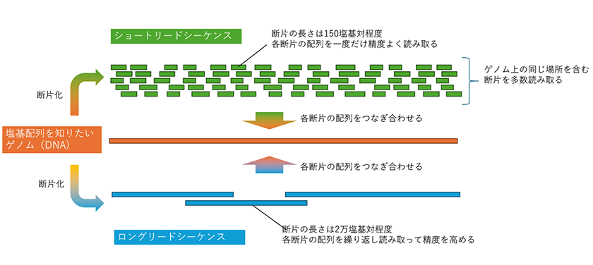 ショートリードシーケンスとロングリードシーケンスの違い(模式図)